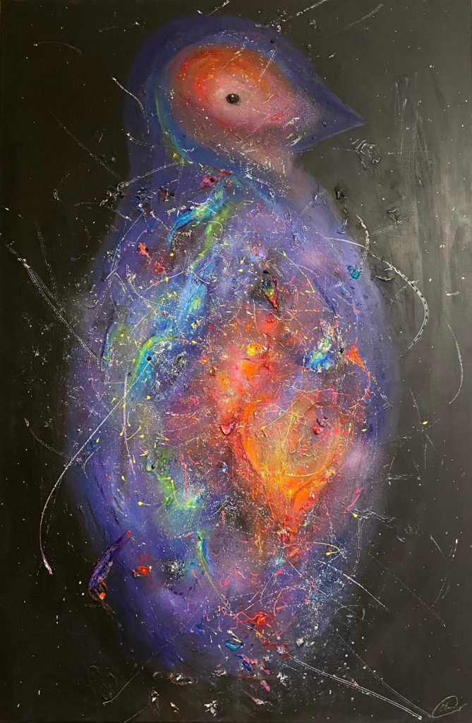 This painting is a journey of transformation that spanned eight years. Initially created as a series of three abstract vortexes, the canvas felt incomplete to me—too common, lacking a soul. I decided to carve into the chaos using black paint, reshaping the swirling energy into a silhouette that spoke to my heart: a Galactic Penguin. At the time, I was trapped in a relationship that stood in stark contrast to my values. I found myself dreaming of the legendary devotion of penguins—their unwavering loyalty and the way they choose a mate for life. This cosmic creature became a totem of the love I lacked but never stopped believing in. It represents a universe of affection waiting to be shared, standing tall against the darkness.